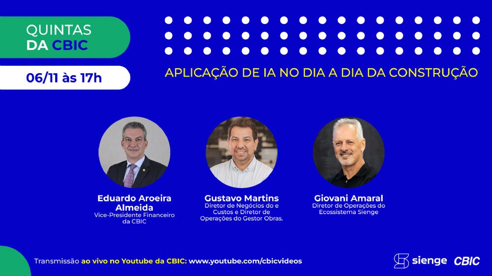 A edição contará com a participação de Giovani Amaral, diretor de operações do Ecossistema Sienge, e Gustavo Martins, diretor de negócios do eCustos e diretor de operações do Gestor Obras. Eles vão compartilhar experiências práticas sobre o uso de soluções baseadas em IA e como essas ferramentas estão otimizando processos, reduzindo custos e elevando a produtividade das empresas do setor.